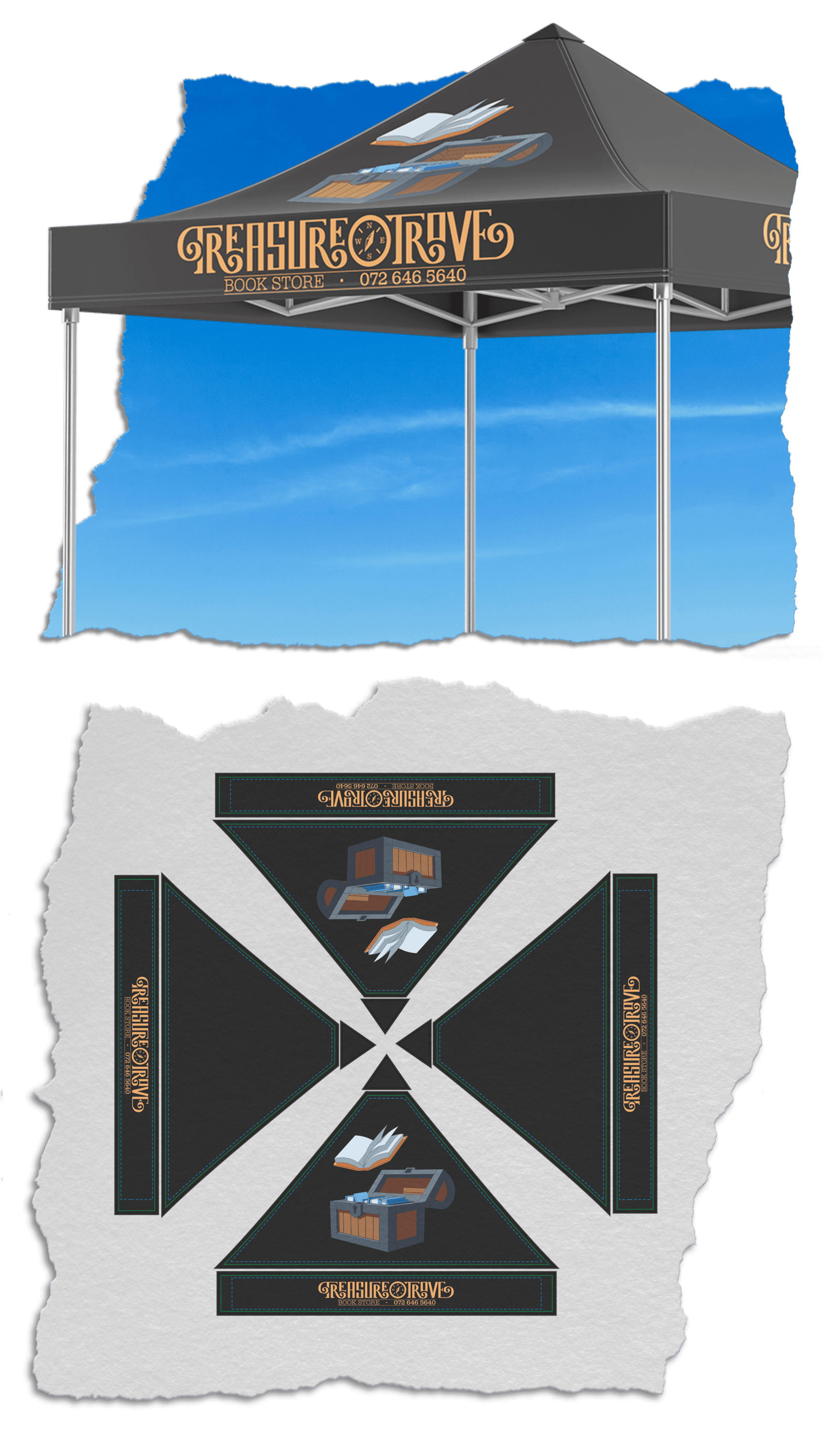The logo and treasure chest were both sketched and then vectorized. The paper was made using various textures and torn up paper edges.